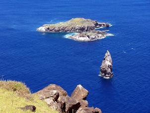 Frente a Orongo podemos ver los célebres islotes de Motu Nui, Motu Iti y