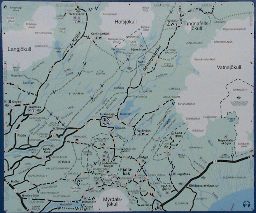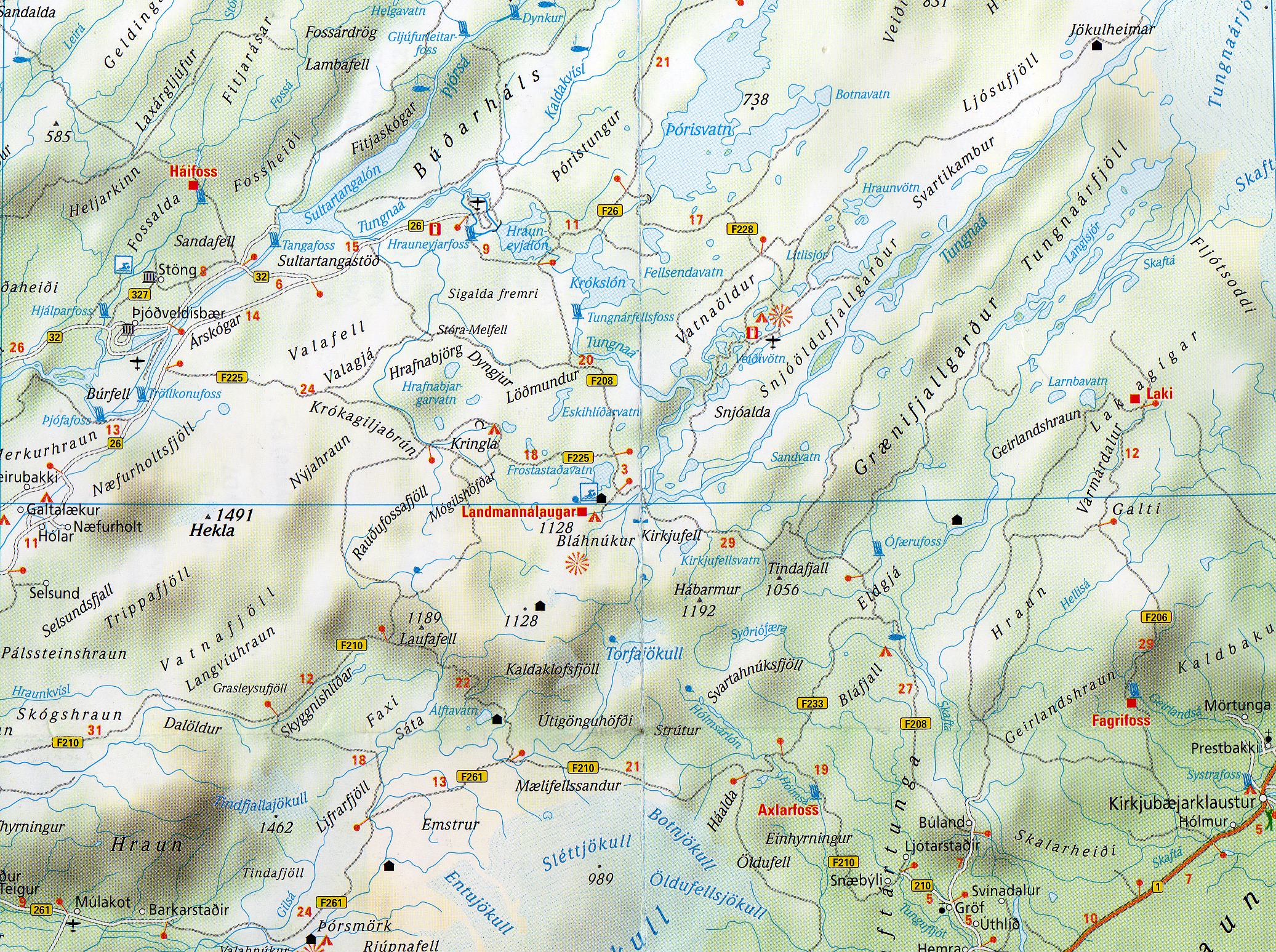 Seguimos rodeando la zona del volcán Hekla por su cara oeste y norte para llegar hasta nuestro destino que es la montaña Bláhnúkur, la cual destaca a lo lejos por su pico azulado. Comenzamos el ascenso después de los preparativos y las recomendaciones de José Mª y Félix. Esta montaña tiene una altitud de 943 m y la ascensión no es excesivamente complicada salvo en algún tramo con demasiada grava y más empinado. La vista desde arriba es impresionante. A dos vertientes se nos ofrece a nuestros ojos, por un lado, un paisaje característico de cárcavas muy desarrolladas y una incipiente red fluvial y por el otro una colada enorme de lava (campo de lava de Laugahraun) con bloques de obsidianas**. Hacia esta última zona nos encaminamos en la bajada, la cual resulta algo peligrosa en algunos tramos por las rocas sueltas. Nos detenemos de vez en cuando al cruzar arroyos y manantiales y, sobre todo, en las fumarolas y depósitos sulfurosos que hay en este tramo. Un mapa de los senderos de la zona podéis ver aquí.