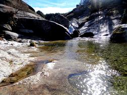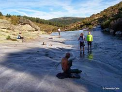 Por la mañana, nada más desayunar, nos fuimos hacia la Garganta de Valdeascas. Se toma el camino que sale desde la gasolinera de Navarredonda de Gredos. El tramo asfaltado acaba en un pinar donde hay un pequeño aparcamiento. Ha habido que dejar atrás el campamento de Valdeascas. Ahí dejamos los vehículos y comenzamos a andar. Desde este punto se inicia la suave subida por una vereda de tierra, que va remontando el río Valdeascas del Jabalí y nos introduce en la garganta de Valdeascas, encajonada en un enclave granítico que constituye un lugar idóneo para un refrescante baño, siendo este lugar uno de los preferidos por los visitantes de la zona. Recorrer sus numerosas pozas, “playas” y “resbaladeros” es una gozada. Esta ruta puede hacerse en 2 horas ida y vuelta, fácil. Lo que ocurre es que paramos muchas veces pues el lugar lo merece. Eso aumenta bastante el tiempo invertido en la ruta.