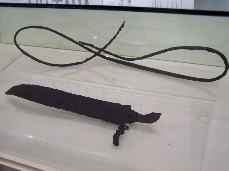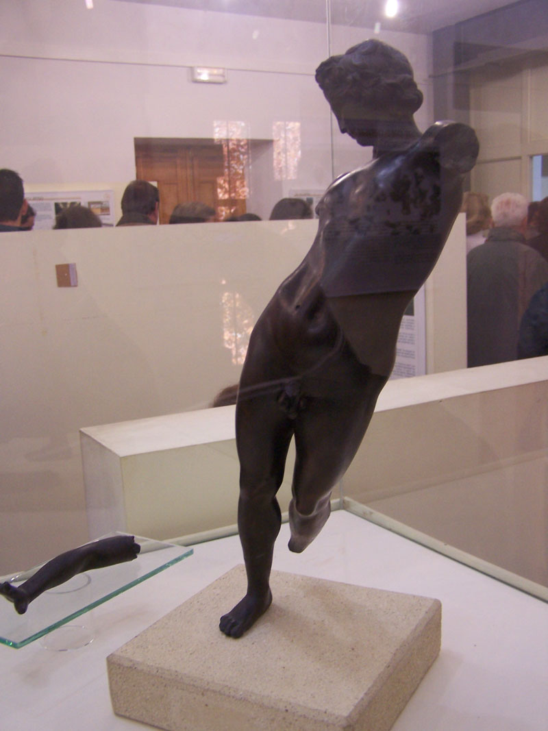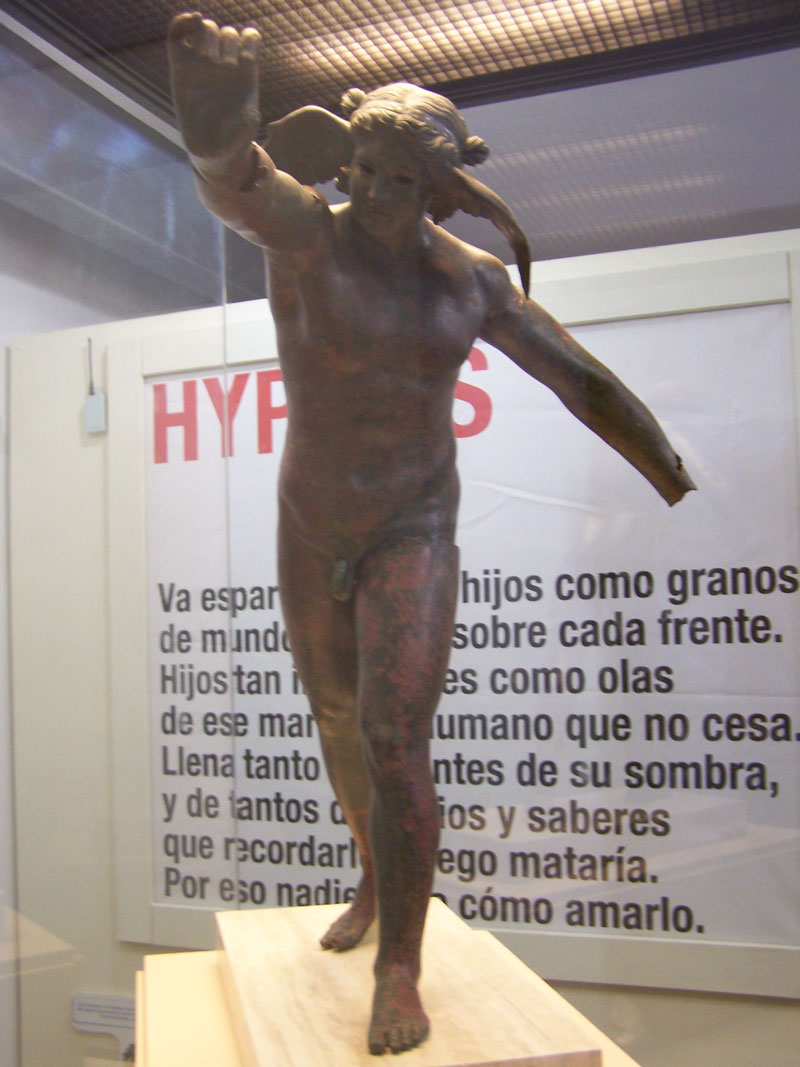 muy bien conservada. Foto 6: Falcata y lanza. Foto 7: Estatua romana. Foto 8: Figura masculina y femenina. Foto 9: Figura en bronce dedicada al dios Hypnos.  |